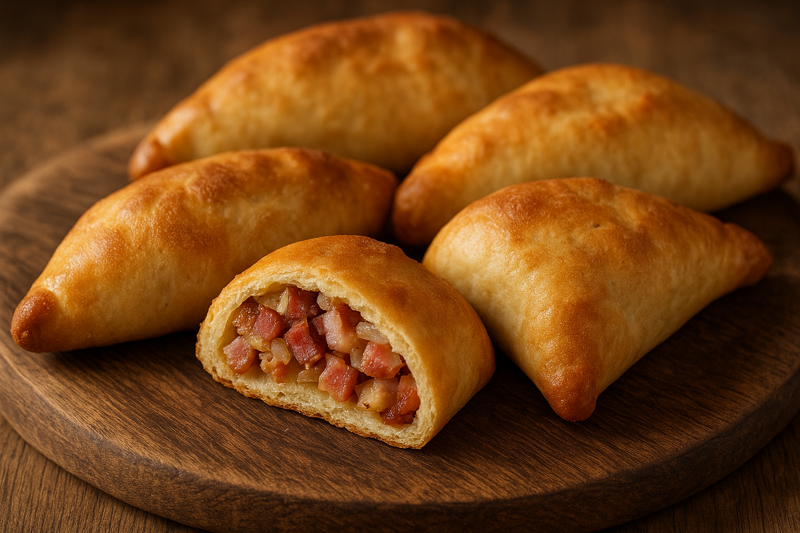 Hitið mjólkina/vatnið. Bætið gerinu út í og leyfið því aðeins að vakna. Blandið sykrinum, saltinu, egginu og smjörinu við. Bætið hveiti við og hnoðið. Látið deigið hefast í tæpan klukkutíma. Skiptið svo deiginu í 30 litla hluta. Rúllið hverjum bita fyrir sig í kúlu og leyfið henni að liggja í 15 mínútur. Steikið lauk og beikon á pönnu og piprið að vild. Pressið þá hverja deigkúlu fyrir sig og setjið fyllinguna í miðjuna. Svo er deigið togað yfir fyllinguna svo hálfmáni myndist og aðeins þjappað saman.