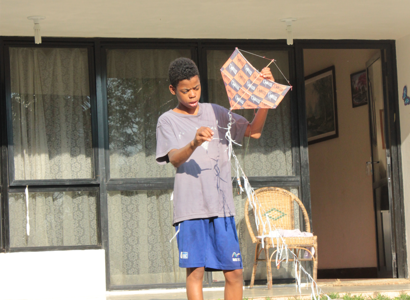 Með andlitið hulið undir marglitri derhúfu nýtur hinn 13 ára Dudu sólarinnar og flýgur flugdreka með...